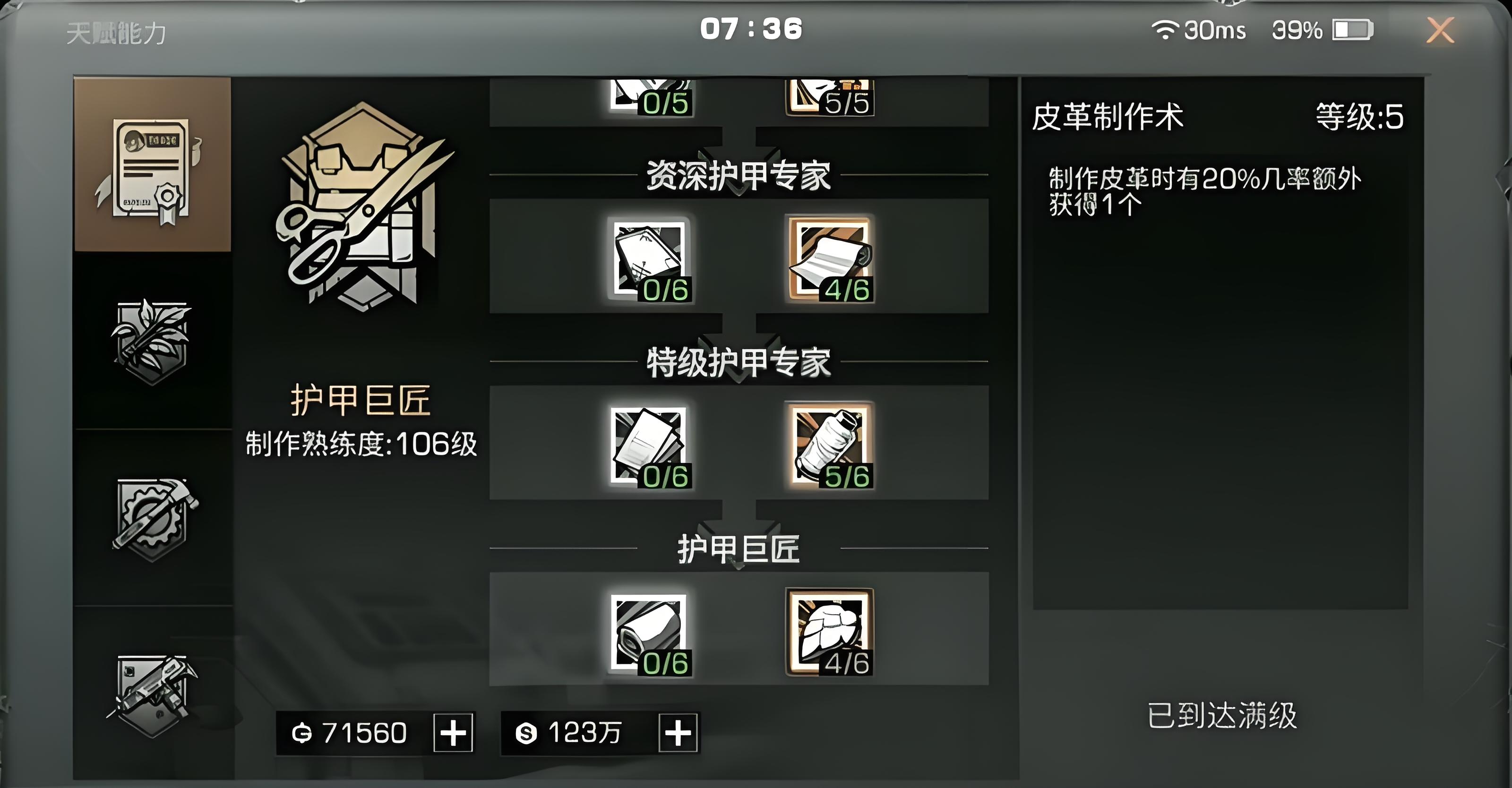 5、護甲工學習皮革制作術天賦后,制作時有20%幾率額外獲1個提升收益,其他職業無此優勢但可通過購買或自制獲取皮革。