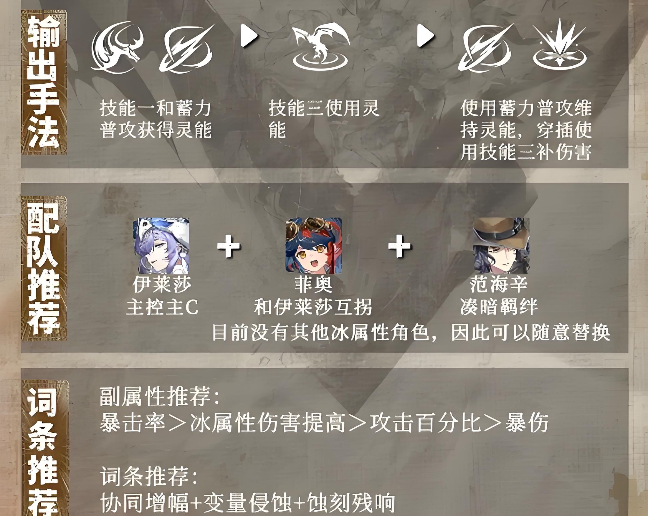 2、裝備副屬性優先堆暴擊率和冰屬性傷害,暴擊率建議超50%,其余補攻擊百分比或爆傷,特效詞條選變量侵蝕與協同增幅。