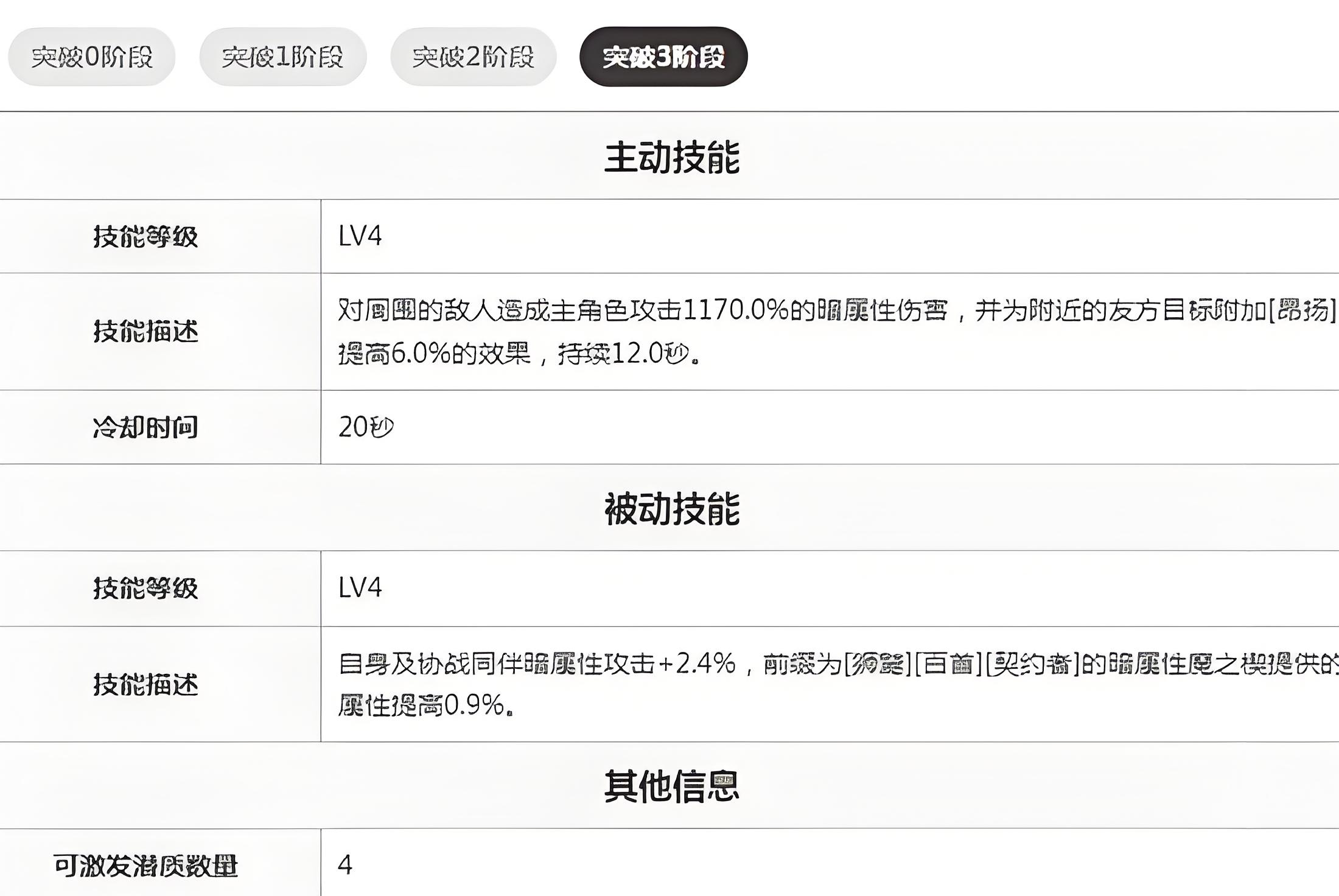 3、被動技能為自身及協戰同伴加2點4%暗屬性攻擊,隊伍有特定前綴暗魔靈時額外獲0點9%屬性提升形成疊加優勢。