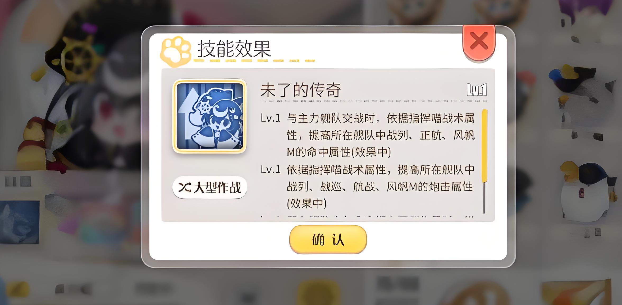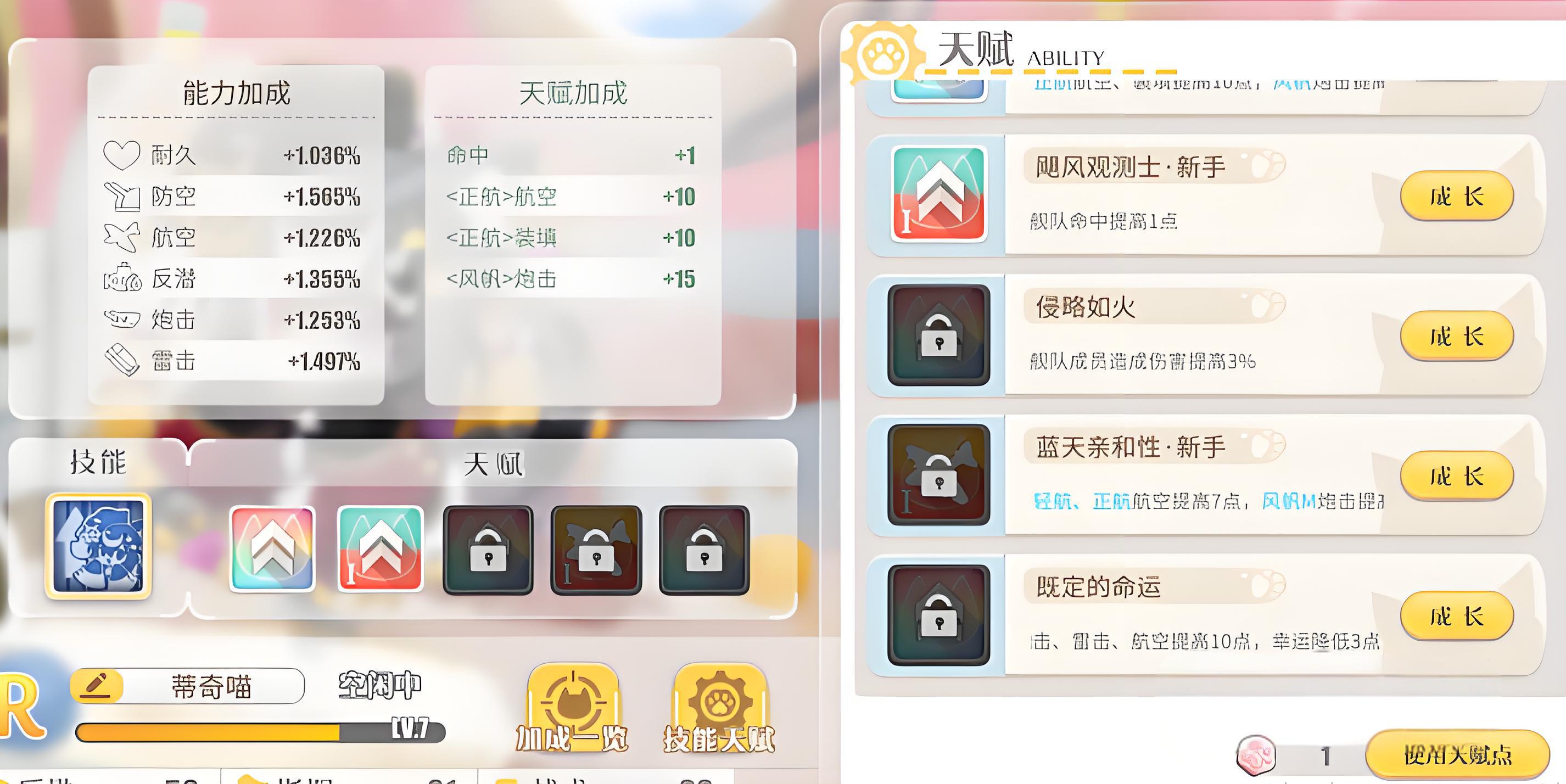 2、屬性定位側重加成,無明確司令貓參謀貓劃分,戰術與指揮屬性突出,對航空與炮擊屬性加成較多適配對應編隊需求。