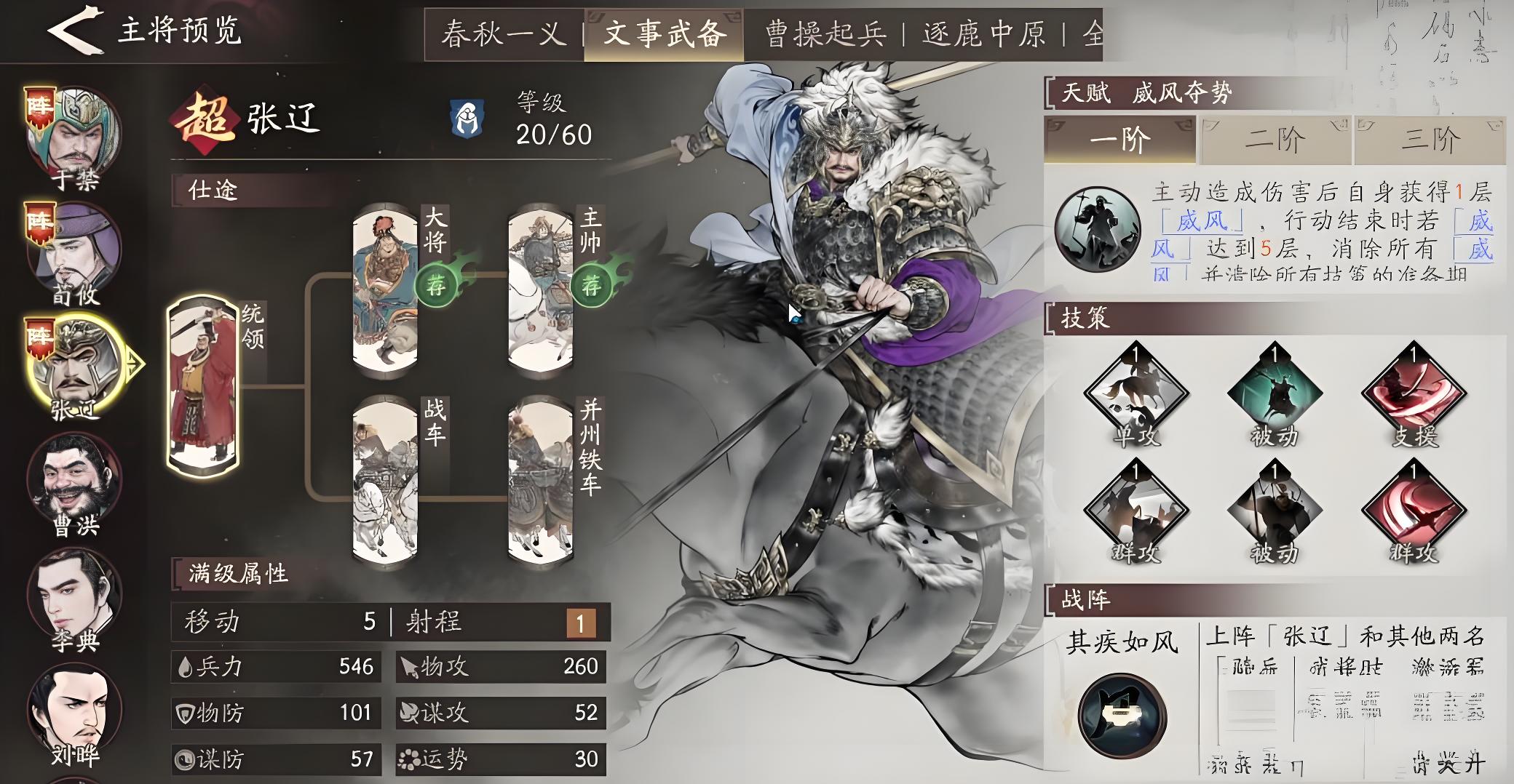 1、基礎屬性均衡且數值合理,移動力5射程1,兵力546物攻260物防101謀攻52謀防57運勢30,滿級解鎖核心天賦長驅。