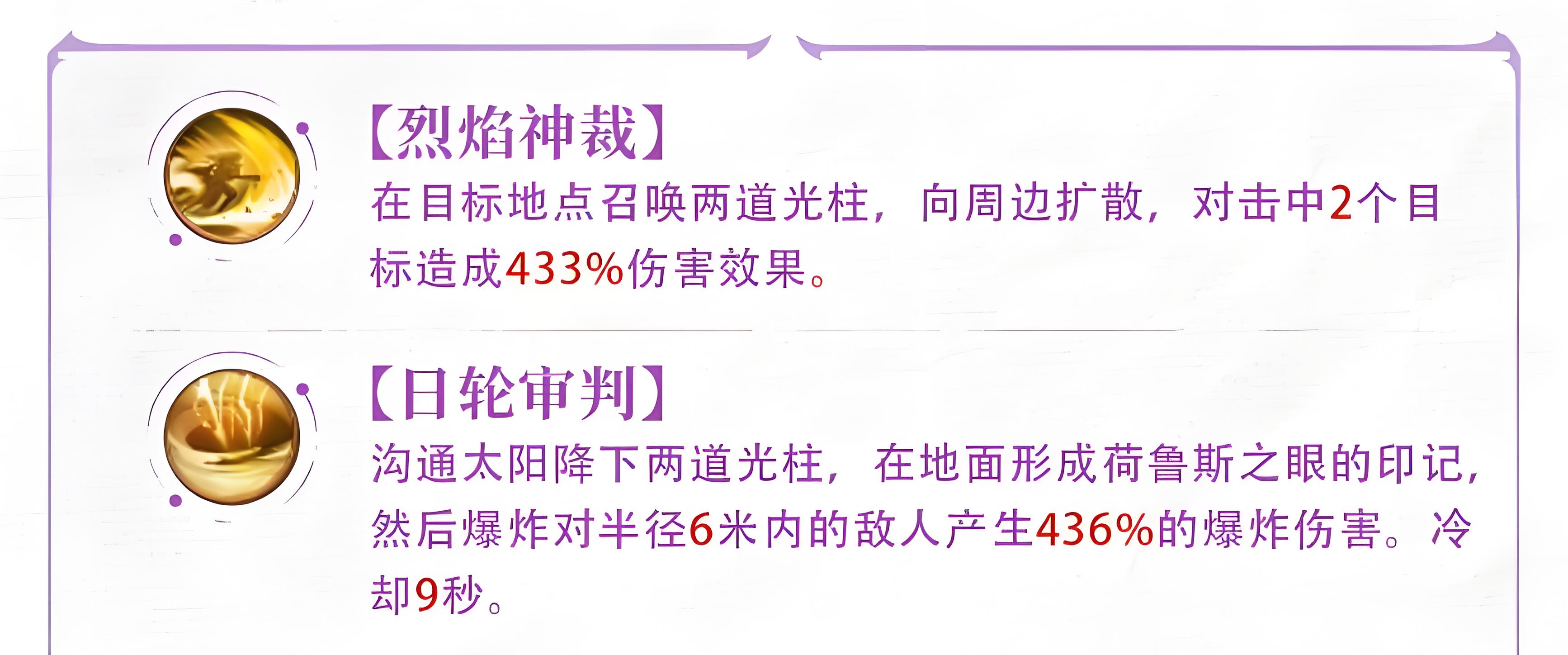 2、日輪審判溝通太陽降下兩道光柱,地面形成荷魯斯之眼印記后爆炸,對半徑內敵人造百分比爆炸傷害且有冷卻時間。