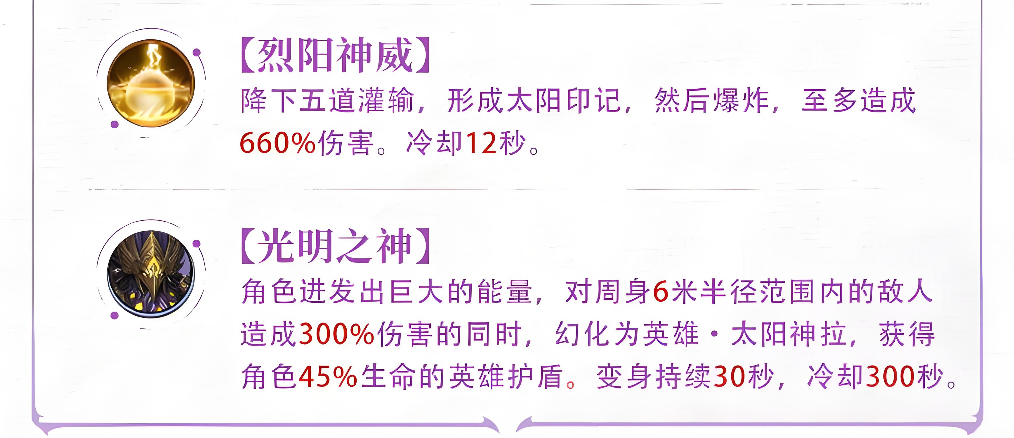 3、烈陽神威降下五道蘊含神力的光柱形成太陽印記,隨后爆炸至多對范圍內敵人造成百分比傷害且有冷卻時間。