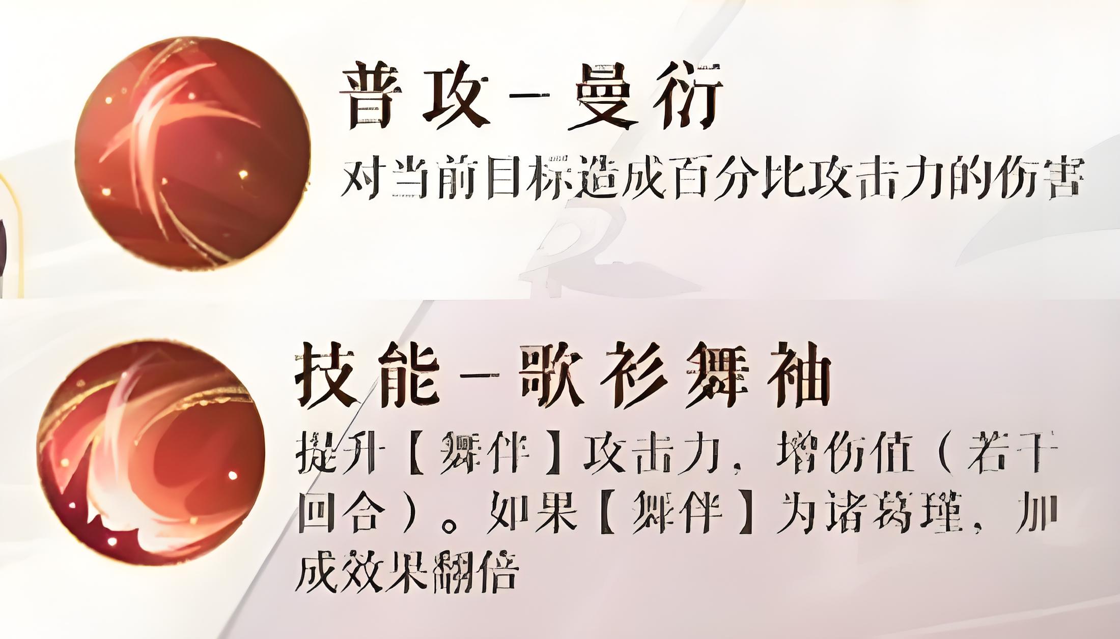 2、核心輔助歌衫舞袖提升舞伴攻擊力并加額外傷害,效果持續多回合,穩定強化隊友輸出能力。