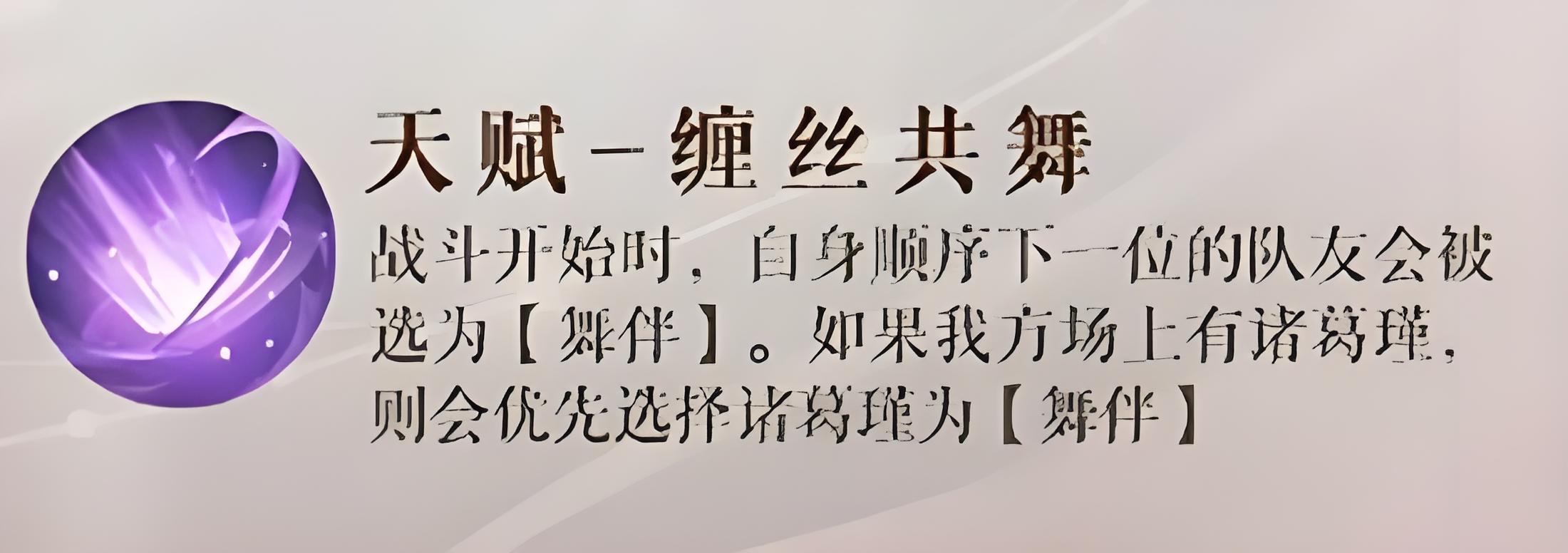 4、天賦纏絲共舞戰斗開始瞬間,依據場上隊友排列順序自動選一位為專屬舞伴,無需手動操作。