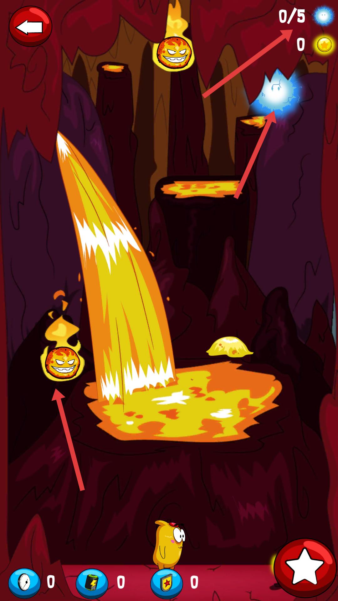 3、操控角色在充滿巖漿和火焰球體的場景中移動,收集藍色發光體,同時避開火焰球體等危險障礙。