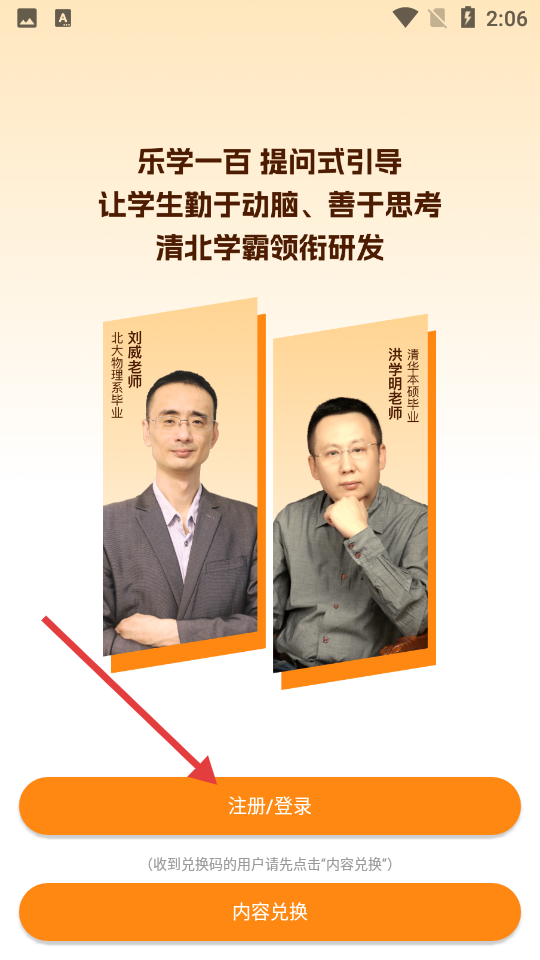 1、樂學一百啟動頁強調提問式引導,由清北學霸研發,展示劉威和洪學明老師,下方有注冊登錄和內容兌換按鈕。