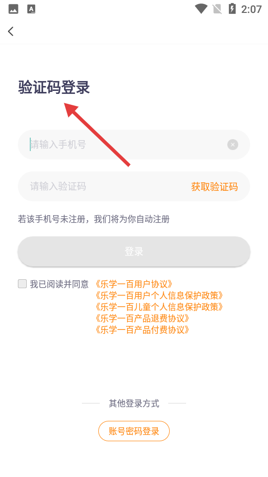 2、樂學一百驗證碼登錄界面,需輸入手機號和驗證碼,未注冊手機號將自動注冊,有相關協議及其他登錄方式選項。