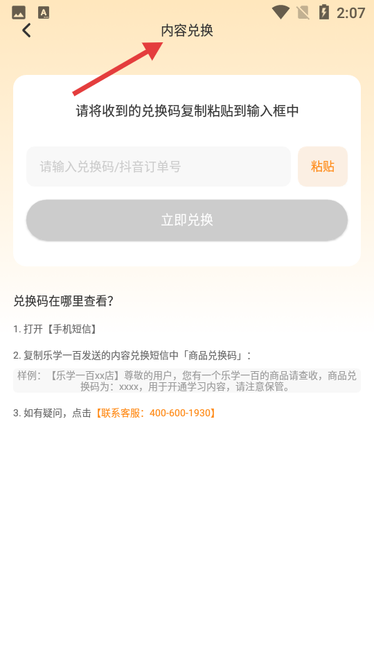 3、樂學一百內容兌換頁面,提示將收到的兌換碼復制粘貼到輸入框,有立即兌換按鈕,還說明兌換碼查看方式和客服電話。