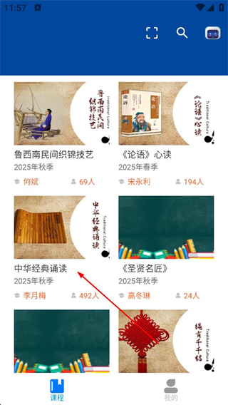 1、點擊課程界面,頂部有搜索功能,以引領未來為主題,下方展示多門課程,含課程名稱、學期、教師及學習人數等信息。
