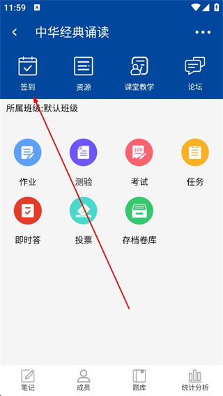 4、在課程主界面找到簽到功能按鈕并點擊,完成當日的課程簽到,可繼續使用資源等功能開展學習。