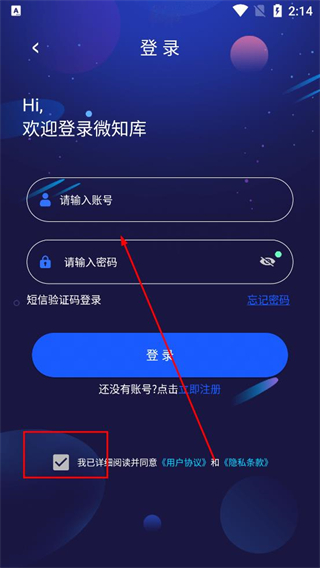 1、打開微知庫軟件,進入登錄頁面,勾選已閱讀并同意相關協議,輸入賬號和密碼后點擊登錄按鈕,完成賬號登錄。