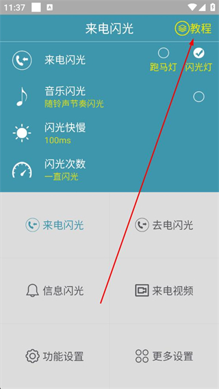 1、打開來電閃光燈APP,進入主界面,可看到來電閃光音樂閃光等功能選項,點擊右上角教程按鈕,進入使用教程頁面查看相關指引。