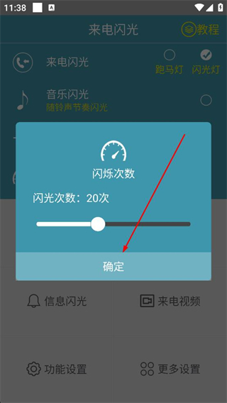 3、根據功能檢測結果處理未開啟的權限,返回主界面后找到閃光次數選項,點擊進入閃光次數調整頁面,拖動滑塊設置次數。