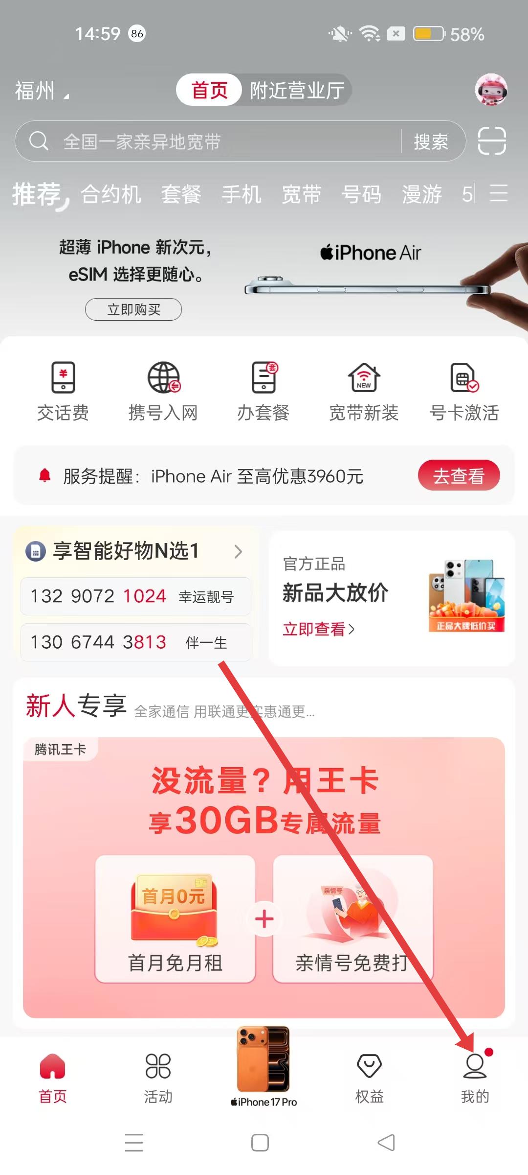 1、打開中國聯通APP進入首頁,點擊右下角我的,進入個人頁面,開始合約機查看流程。
