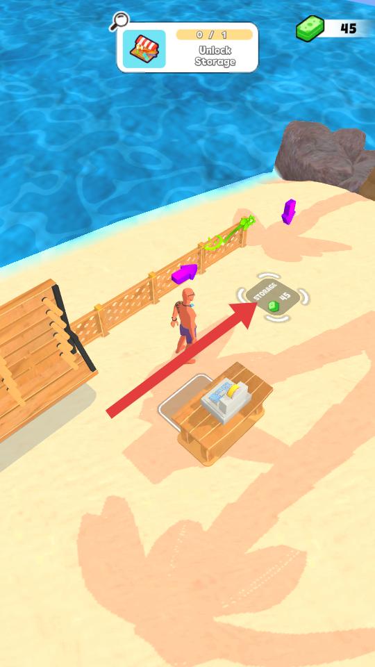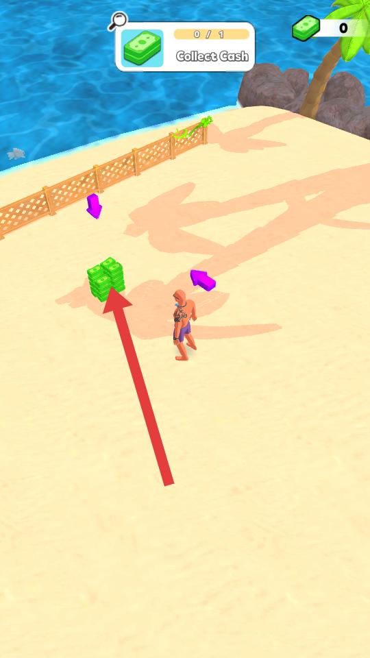 1、進入游戲,先去收集現金,在沙灘上找到現金堆,靠近并收集它們,積累初始資金,為后續經營做準備。