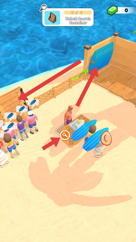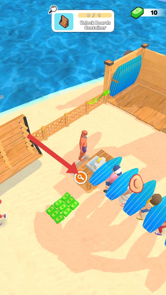 3、接著去解鎖木板容器,同時還會有顧客前來,要關注顧客需求,為他們提供服務,比如分發沖浪板等物品。