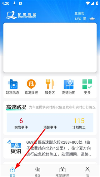2、點擊路況信息可查看預警信息、突發事件、計劃施工等板塊,了解甘肅省高速公路的氣象災害風險提示和路況預警,做好出行準備。