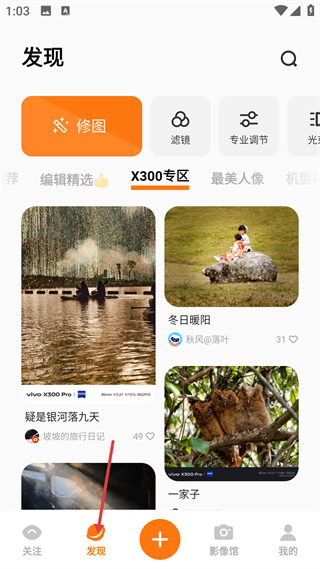 3、發現界面提供修圖濾鏡等工具,分編輯精選機型專區等板塊,展示各類攝影作品,支持內容創作與分享。