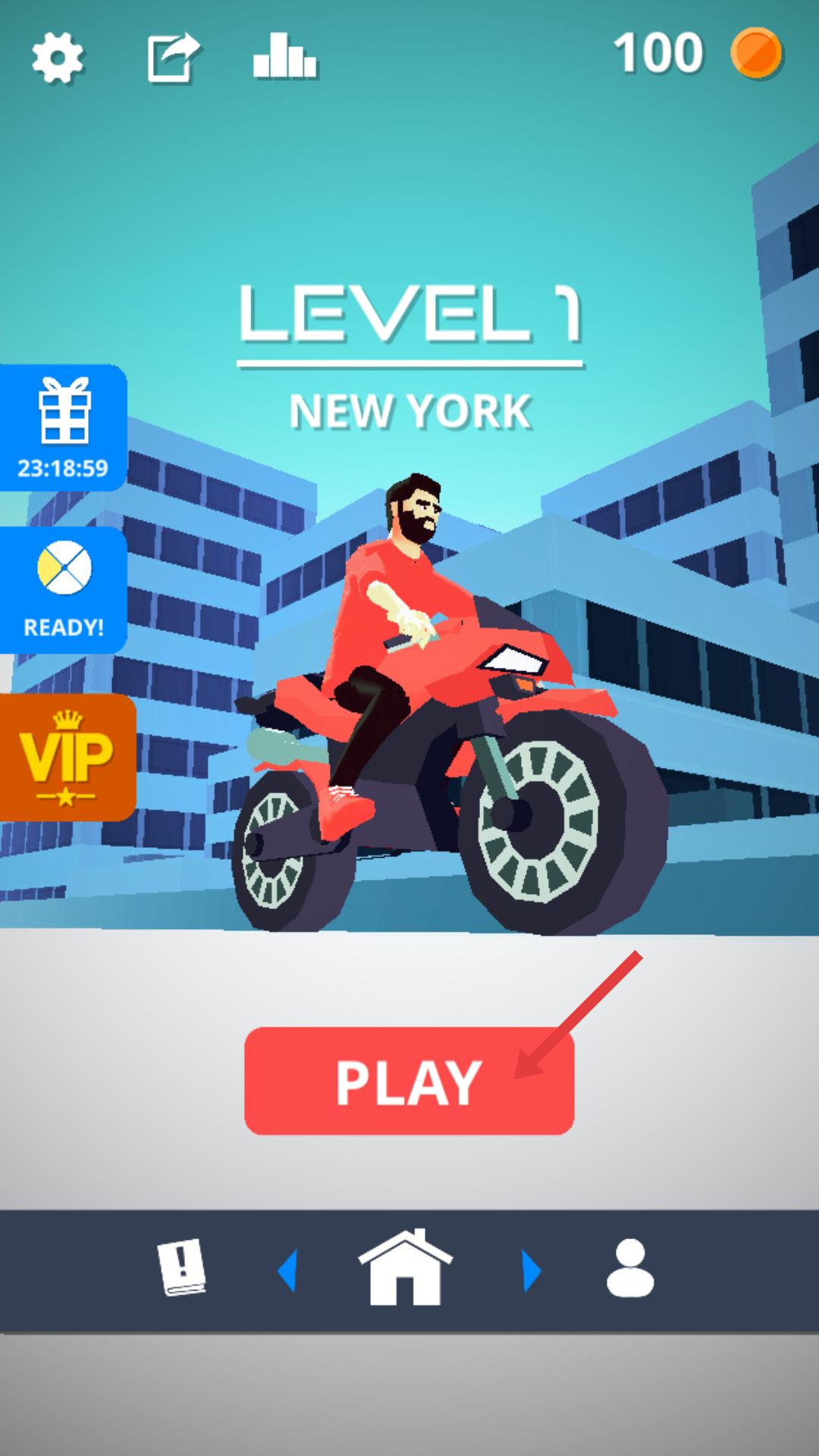 1、游戲界面顯示游戲目前處于第一關,點擊紅色PLAY按鈕,開始第一關,操控騎紅色摩托的角色在紐約場景中挑戰。