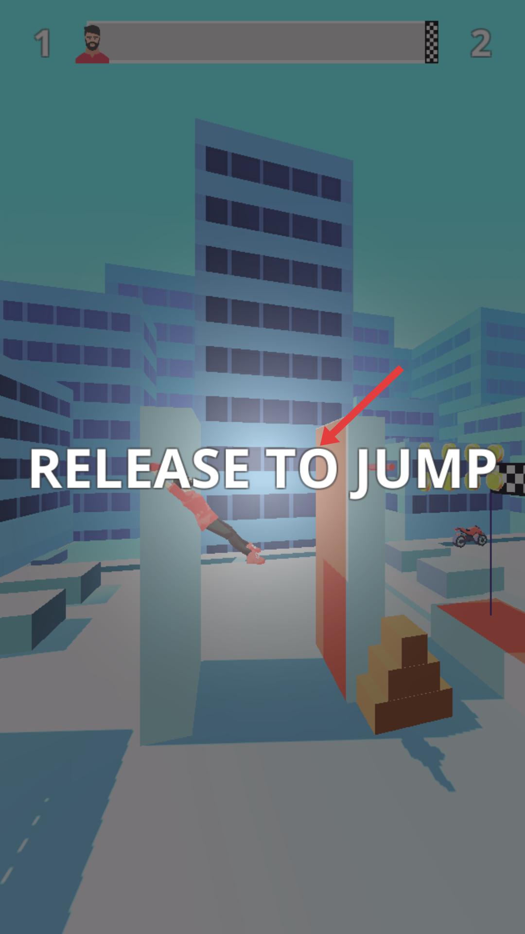 3、當看到松手跳躍的提示時,松開按住的屏幕,讓角色跳躍,跨越障礙,向目標位置前進。