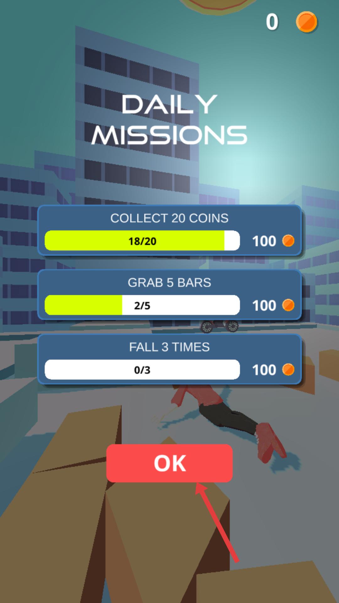 4、界面顯示游戲結束,收集20個硬幣、抓住5個橫桿,完成后點擊OK按鈕,可領取獎勵,助力游戲。