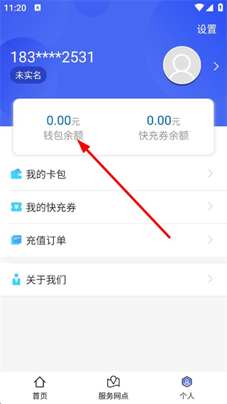 3、進入個人界面,可查看錢包余額、快充券余額,管理我的卡包、快充券、充值訂單等,了解賬號未實名狀態。