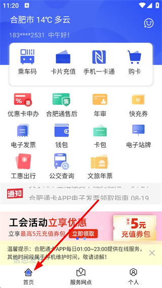 1、進入首頁,可使用乘車碼、卡片充值等出行服務功能,還可辦理優惠卡、查詢公交等,查看通知和工會活動優惠信息。