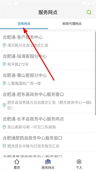 2、點擊服務網點,可查看自有網點和代理網點信息,如合肥通客戶服務中心等具體網點地址,方便線下辦理業務。