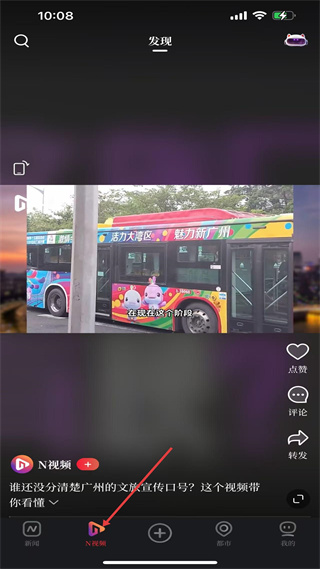 3、N視頻板塊展示廣州文旅宣傳口號解讀視頻,用戶可點贊、評論、轉發,以視聽形式呈現本地資訊。