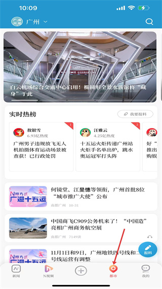 4、都市板塊聚焦廣州,發布白云機場交通中心啟用、無人機違規拍攝等新聞,有實時熱榜和報料功能,方便市民關注本地動態并報料。