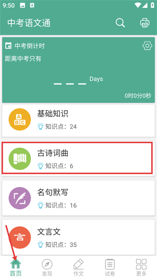 2、進入APP主界面,點擊基礎知識選項,進入基礎知識學習頁面,這一步是為了開始系統學習中考語文的基礎內容。