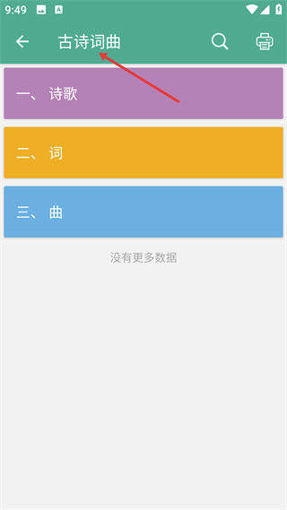 2、古詩詞曲模塊分為詩歌、詞、曲三個子分類,分類清晰明確,能精準查找對應古詩詞曲內容。