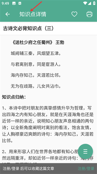 4、知識點詳情呈現古詩文原文,歸納核心考點,登錄賬號后可收藏內容,助力掌握中考考點。