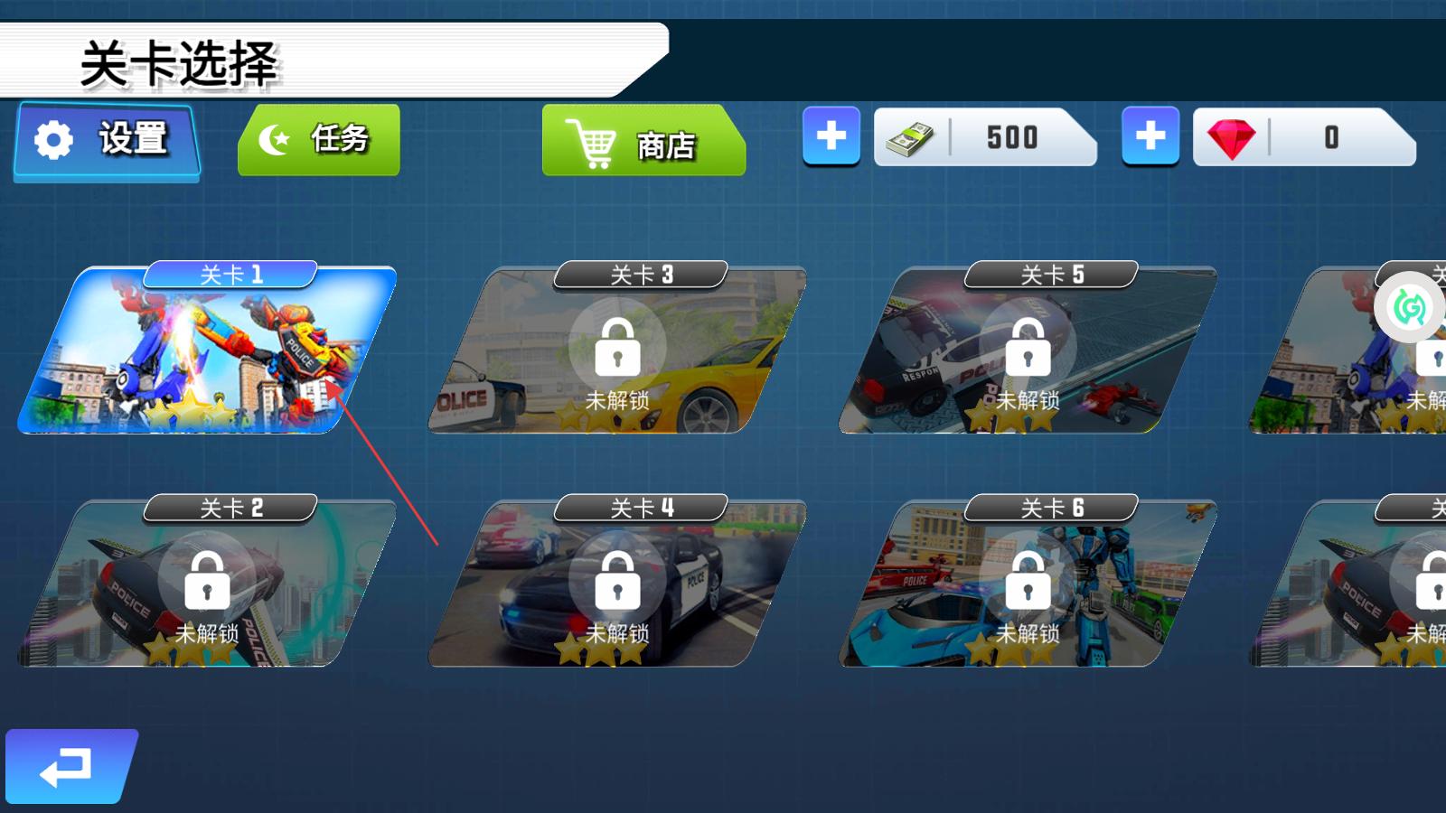 3、在關卡選擇頁面,玩家能看到關卡1等可選關卡,點擊關卡1,即可進入游戲準備界面。