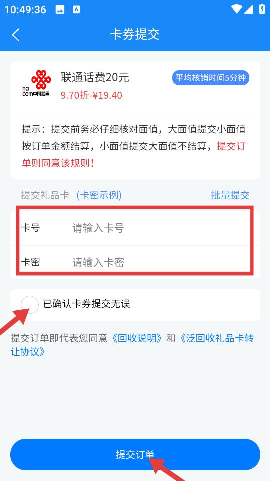 3、卡券提交頁面頂部呈現聯通話費20元的卡券信息及折扣,中間設有卡號、卡密輸入框,下方需勾選已確認卡券提交無提交訂單即可完成回收操作。