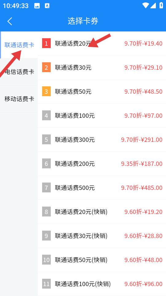 2、選擇卡券界面左側分類欄清晰列出聯通話費卡、電信號費卡、移動話費卡選項,右側展示聯通話費的不同面額。