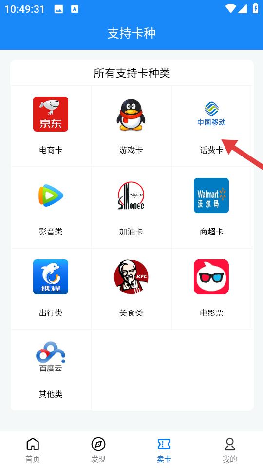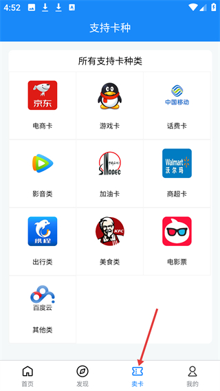 3、賣卡頁展示所有支持卡種類,涵蓋電商卡、游戲卡、話費卡等多類卡種,方便用戶選擇要回收的卡種。