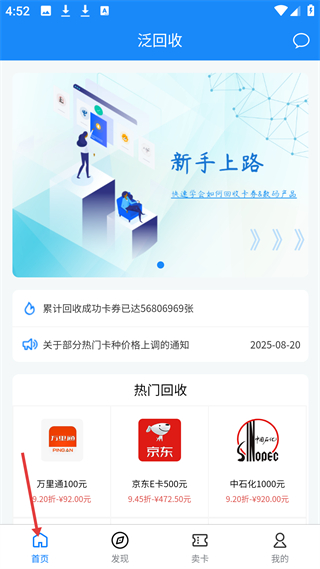 1、首頁有新手上路指南和熱門回收卡券展示,累計回收卡券數量龐大,還有價格調整通知,助力用戶了解卡券回收服務和熱門卡種。