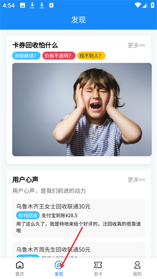 2、發現頁有卡券回收相關話題和用戶心聲展示,呈現用戶真實評價,幫助用戶了解卡券回收的優勢和用戶體驗。