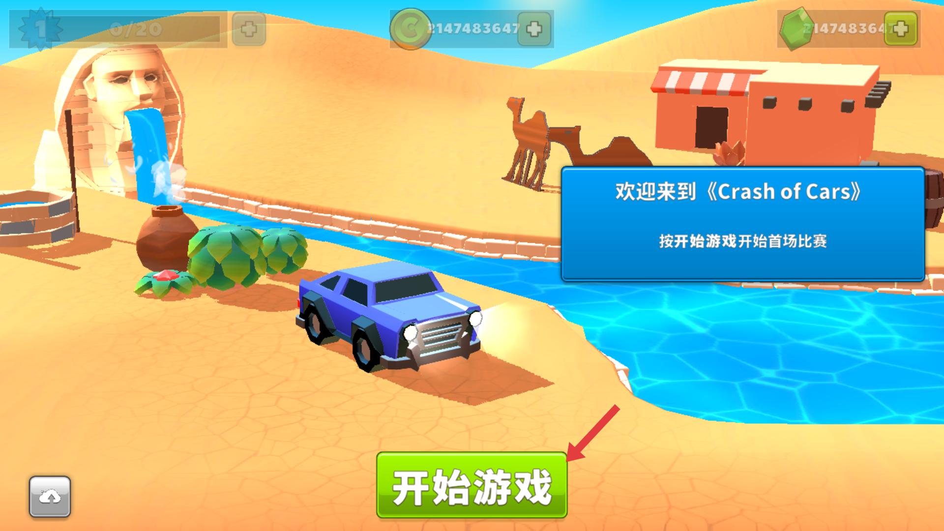1、游戲主界面有綠色開始游戲按鈕,點擊該按鈕,即可進入比賽,開啟汽車對戰之旅。