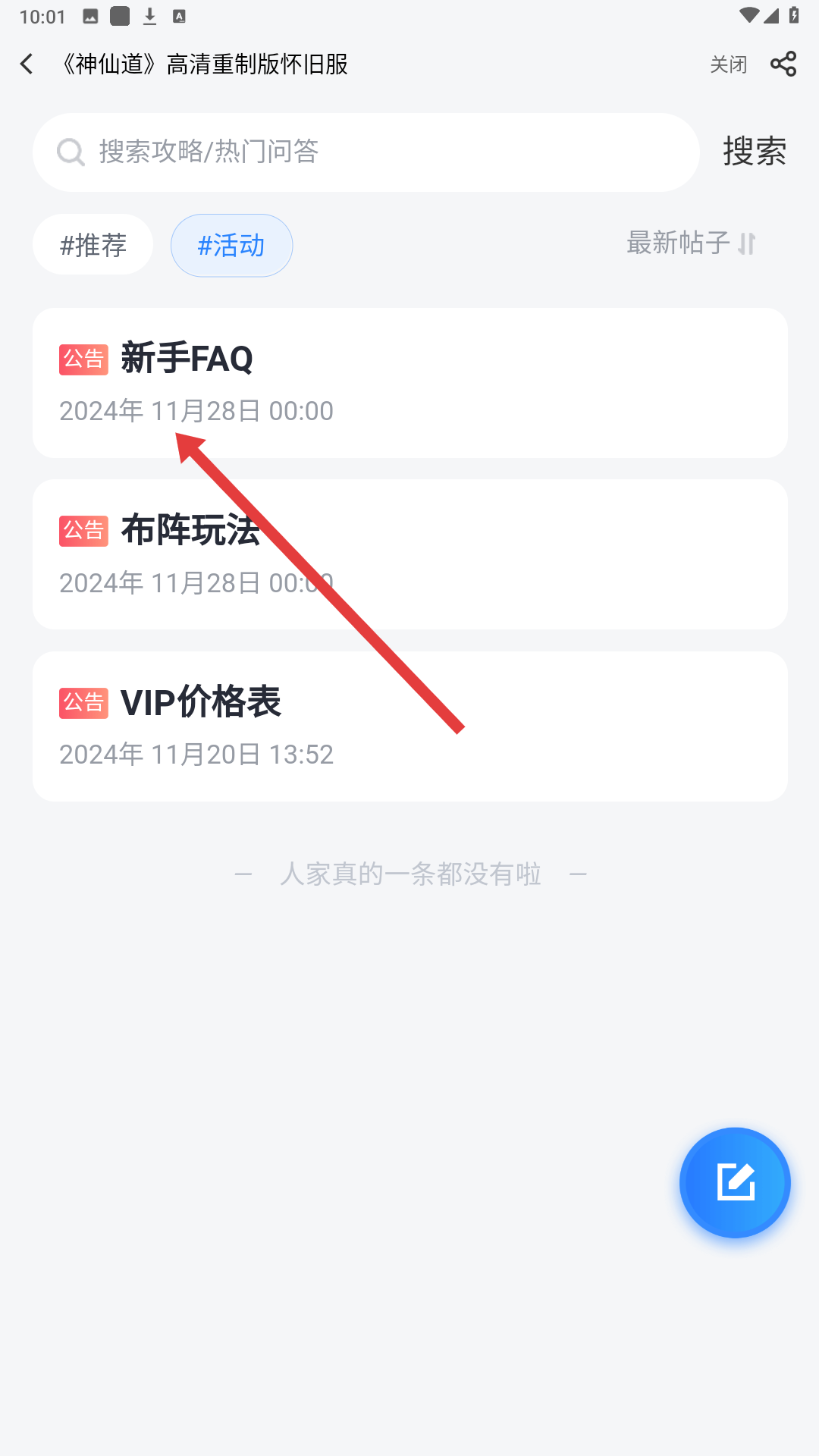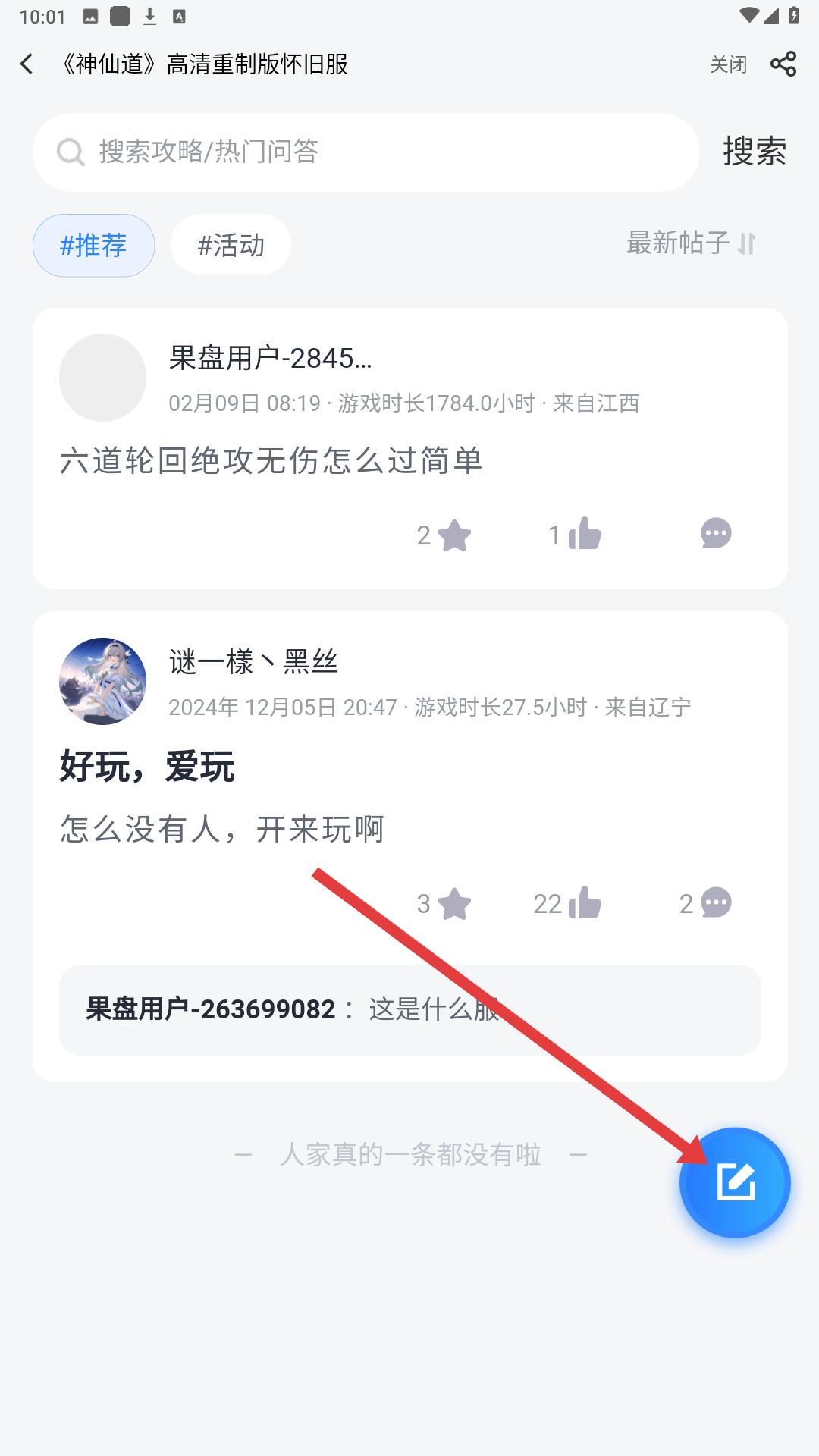 4、游戲社區頁面可查看其他玩家的帖子,還能點擊右下角按鈕發布自己的游戲心得、疑問等,參與游戲交流。