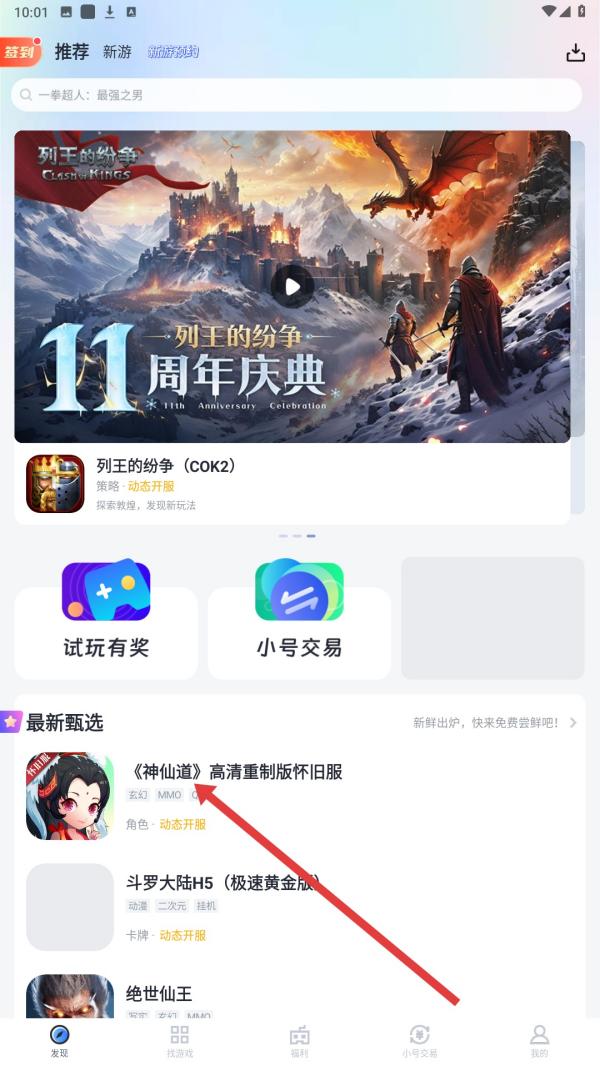 1、進入平臺首頁,可見簽到、推薦等標簽,還有游戲及最新甄選游戲列表,最新甄選中可找到神仙道高清重制版懷舊服,開啟游戲選擇。