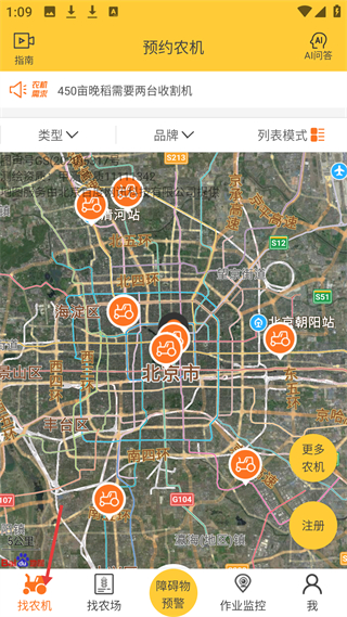 1、預約農機頁面以地圖模式呈現,頂部設指南和AI問答入口,提示緊急需求可發布農機作業,地圖旁有更多農機、注冊按鈕。
