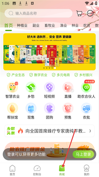 3、商城板塊,涵蓋種植業、畜牧業等多領域,有智慧農業、短視頻、直播等功能入口,展示秋然大米等農產品,開展助農推廣活動。