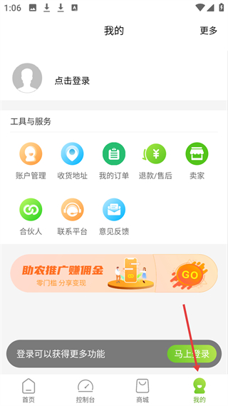 4、我的板塊,提供賬戶管理、收貨地址等工具與服務,有助農推廣賺傭金活動,支持意見反饋,需登錄使用更多功能。