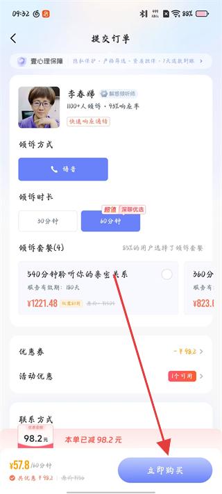 4、在提交訂單頁面選擇傾訴方式、時長、套餐,確認聯系方式和優惠信息后,點擊立即購買,即可完成心理傾訴服務的下單。