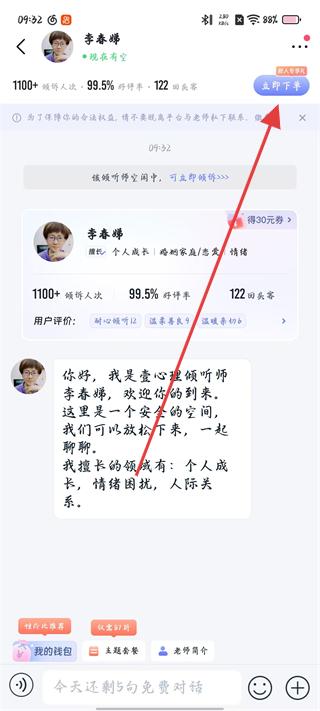 3、在傾聽師詳情頁面可查看其傾聽人次、好評率、回答數等信息,點擊立即下單,進入訂單提交頁面。