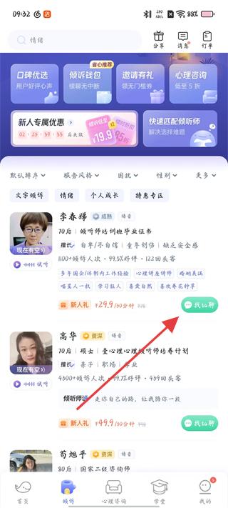 2、切換到傾訴板塊瀏覽不同風格、困擾類型的傾聽師,找到合適的傾聽師后,點擊我要聊,進入該傾聽師的詳情頁面。