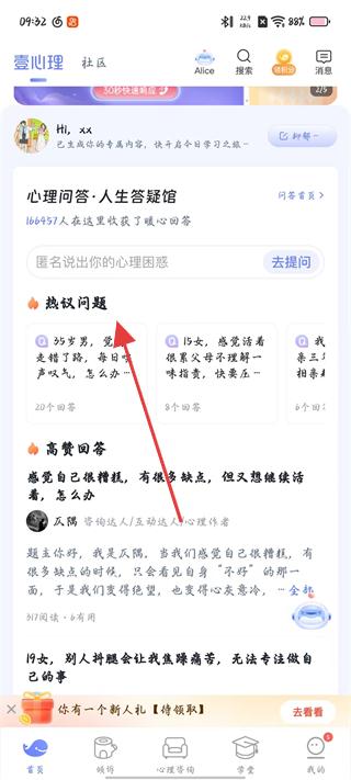 1、進入壹心理首頁,可在心理問答人生答疑館查看熱門問題、高贊回答若有心理困惑,可點擊去提問,也可瀏覽他人的問答內容。